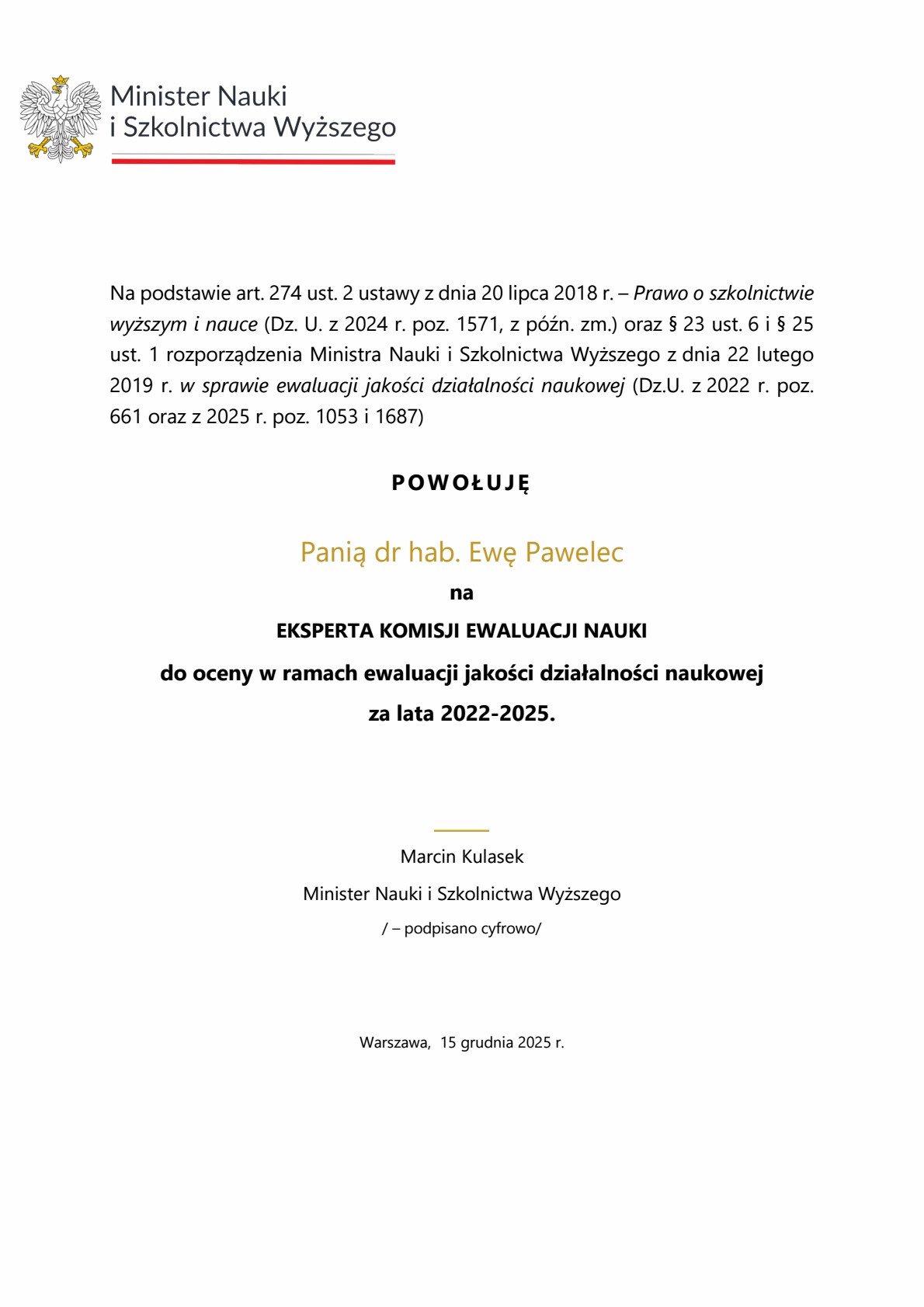 Z przyjemnością informujemy, że nasza koleżanka dr hab. Ewa Pawelec została powołana na eksperta Komisji Ewaluacji Nauki. Powołanie to stanowi wyraz uznania dla jej dorobku naukowego, wysokich kompetencji merytorycznych oraz autorytetu w środowisku akademickim. Serdecznie gratulujemy i życzymy satysfakcji oraz owocnej pracy w nowej roli.